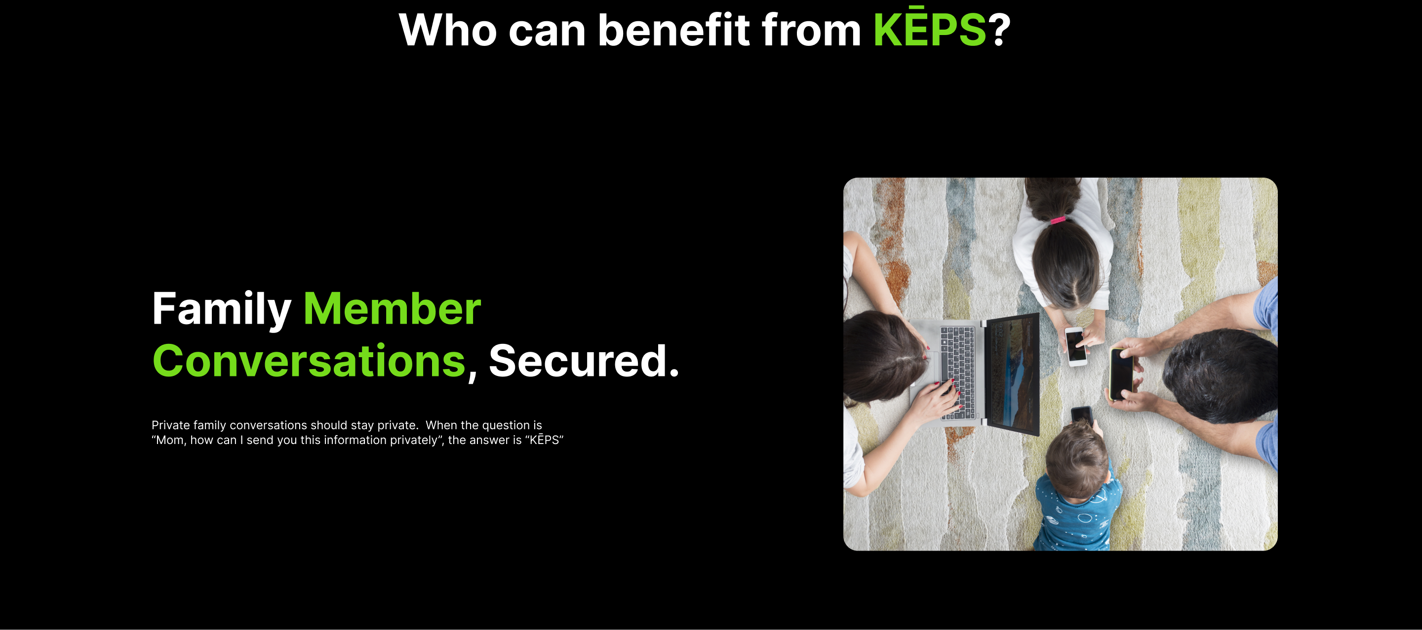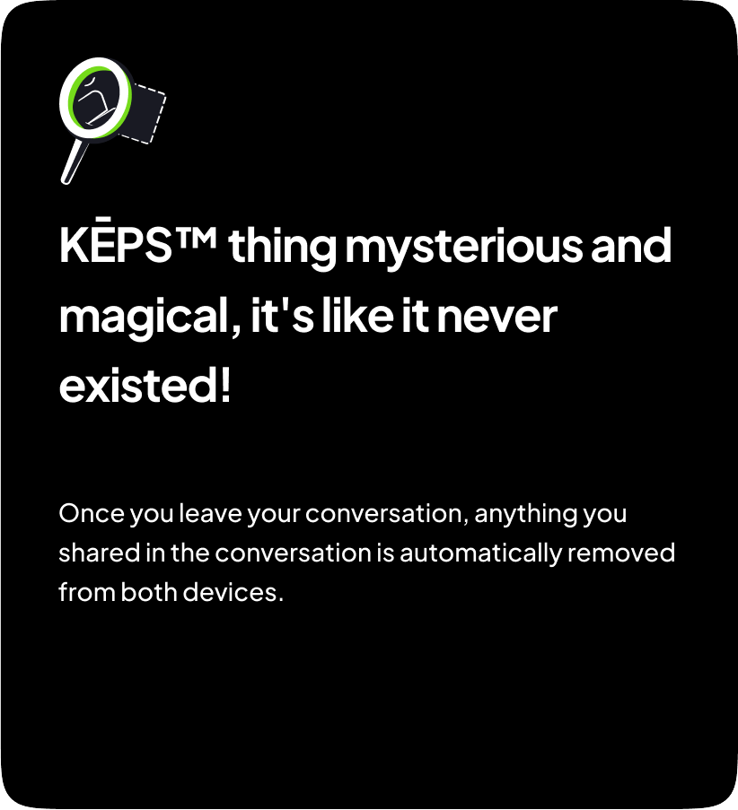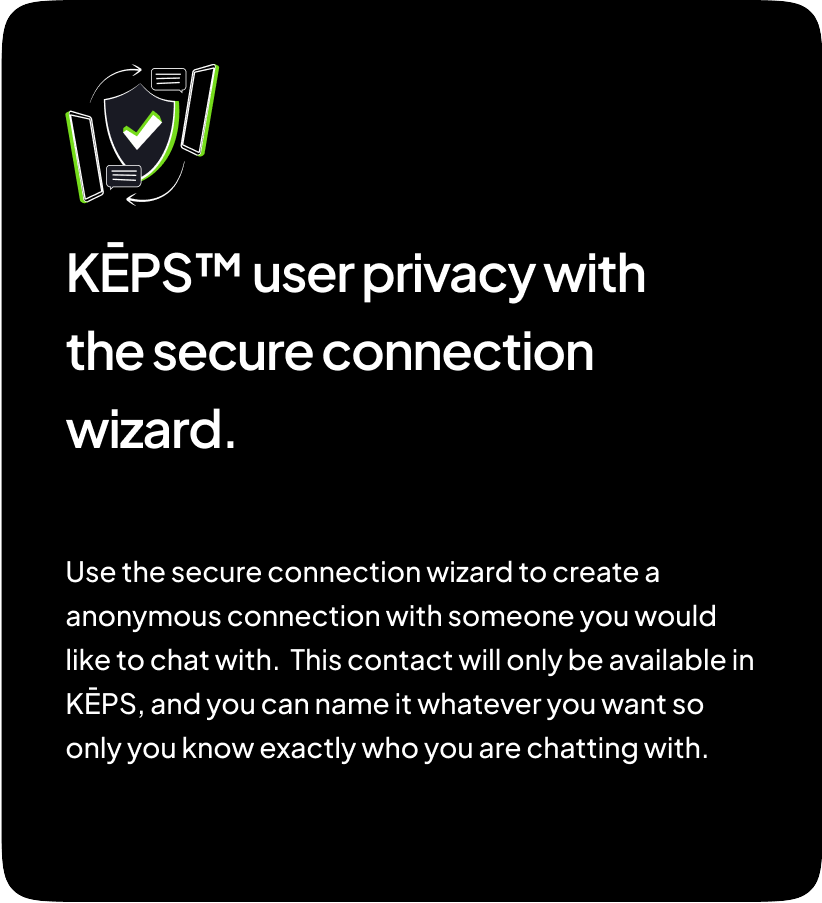 KEPS goal is to provide a practical alternative to centralized server usage in text messaging and telephone calls. Our decentralized server approach allows the user to maintain complete control and ownership of text messages, photo sharing and telephone calls without the worry of having personal information stored, shared or sold to other companies.